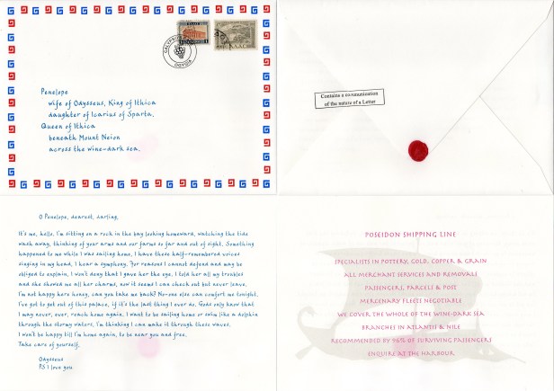 Odysseus anachronistically writes home to Penelope in lyrical terms, on the back of a shipping flyer.
